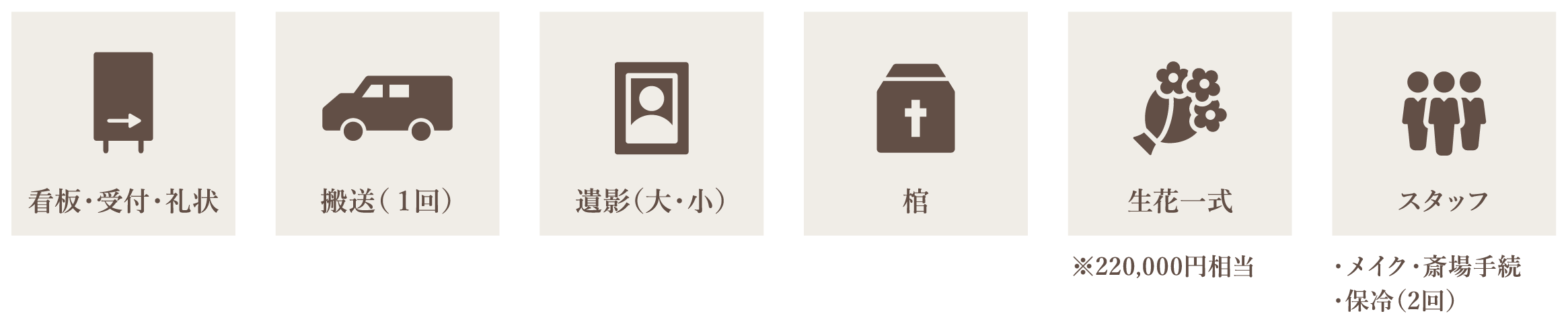 | ご遺体ケア | ・ドライアイス追加/ご遺体安置(24時間)(¥11,000/回) ・湯灌/特殊ケア(¥88,000) ・エンバーミング(¥263,000) |